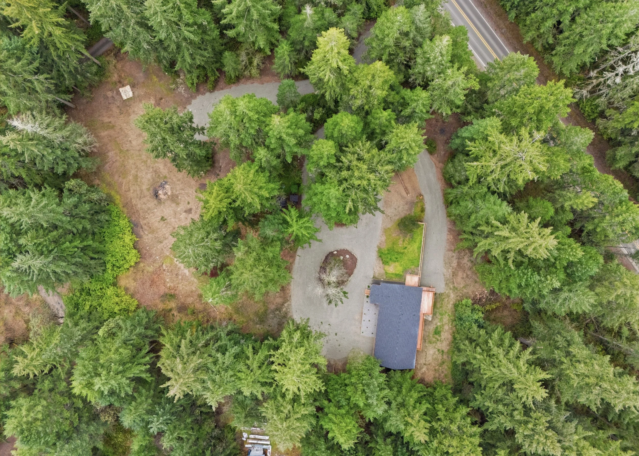 Driveway surfacing appears robust enough for heavy loads; expect to inspect for drainage and surface wear if you plan frequent RV use. The location of the parking keeps vehicles contained and helps preserve the primary outdoor living zones for recreation and gardening.